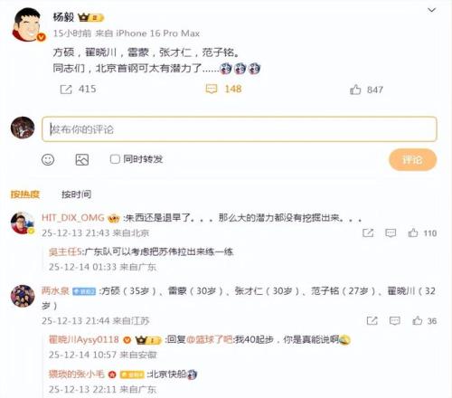 知名篮球评论员杨毅直接讥讽道:“方硕,翟晓川,雷蒙,张才仁,范子铭。同志们,北京首钢可太有潜力了……”
