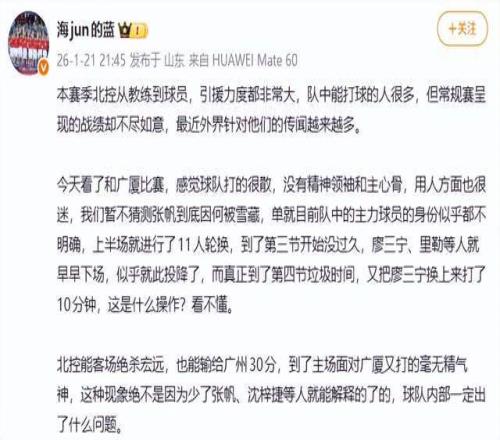 媒体人海jun的蓝就发文谈到了北控男篮——